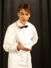 durch feines pantomimisches Spiel mit den Gästen unterhält...